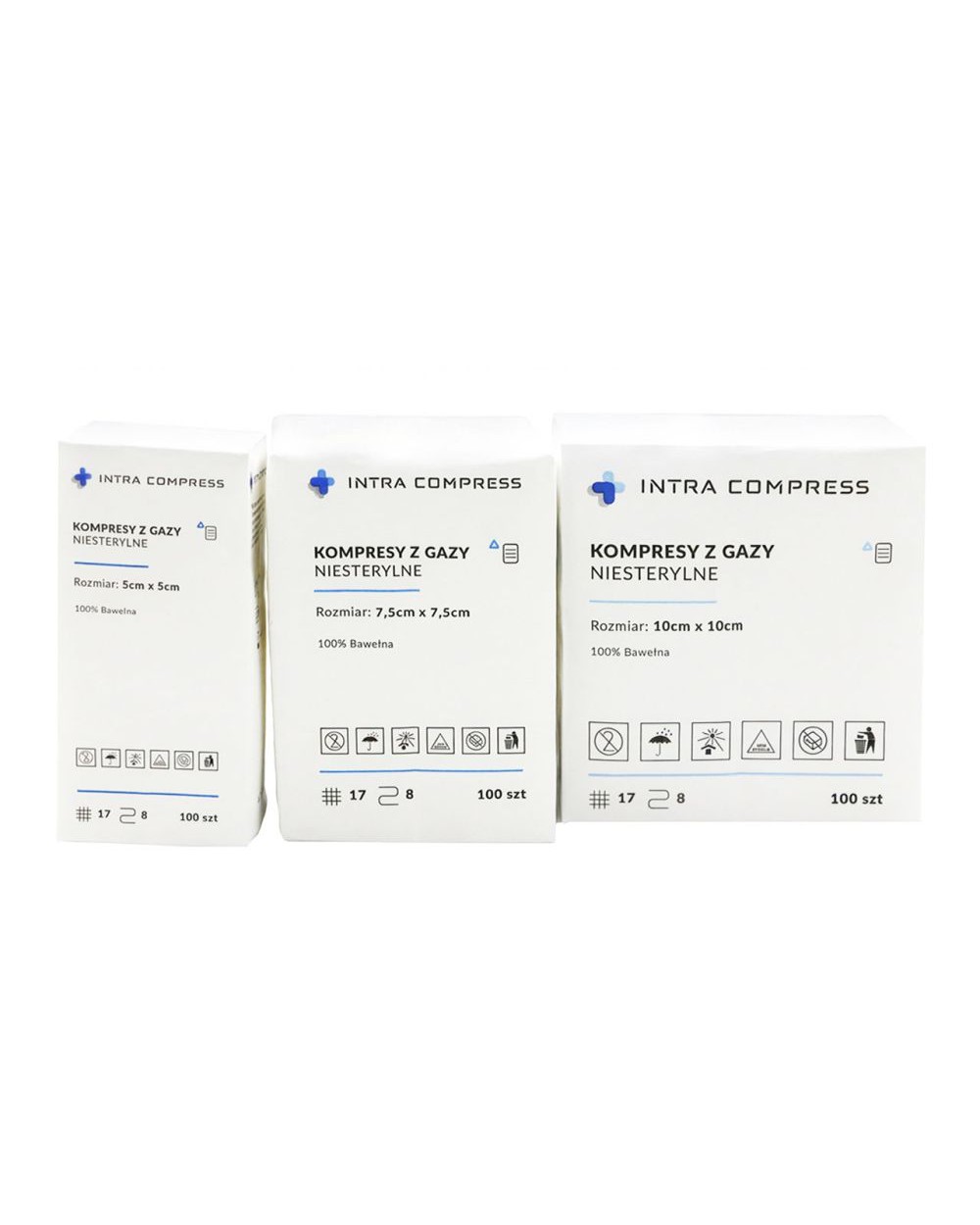 Produkty niesterylne INTRA COMPRESS to wysokojakościowe kompresy 8-warstwowe i 17-nitkowe z gazy bawełnianej, które doskonale znajdują swoje zastosowanie zarówno do opatrywania ran (po wcześniejszej sterylizacji) jak i do codziennego nieinwazyjnego użytku w szpitalach, przychodniach, laboratoriach czy salonach kosmetycznych.