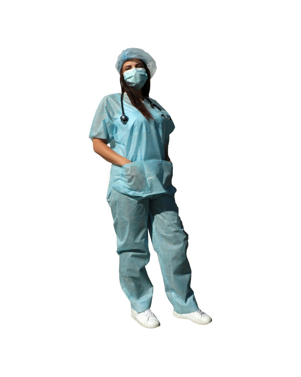 Dwuczęściowy komplet medyczny jednorazowego użytku. Zestaw zawiera fartuch chirurgiczny i spodnie, pakowane parami. Wykonany jest z oddychającej i odpornej na zużycie włókniny polipropylenowej SMS. Materiał ten charakteryzuje się dużą odpornością na wilgoć i przenikanie drobnoustrojów.